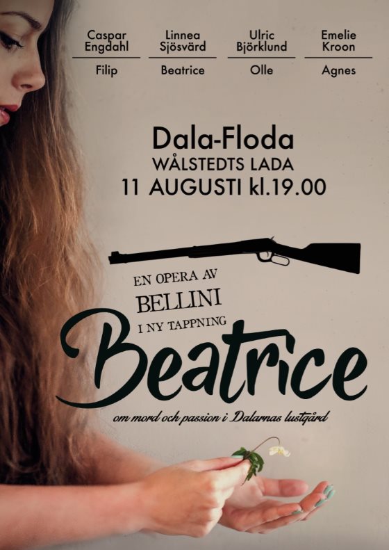 Beatrice är en opera av V. Bellini, nu i Dalamiljö. Fyra unga sångare framför det täta dramat med svindlande vacker musik som utspelar sig mellan gårdarna. Svensk text, ljus, kostym, musiker. Medverkande: Emelie Kroon - mezzosopran, Caspar Engdahl - baryton, Ulric Björklund - tenor, Linnéa Sjösvärd - sopran.